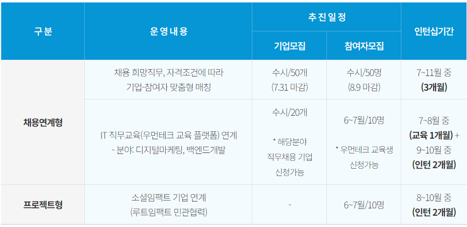 ▶ ‘IT 직무교육 연계 인턴십’은 ‘우먼테크 교육 플랫폼’ 교육과정과 연계하여 디지털마케팅(7월), 백엔드개발(8월) 교육수료자가 인턴십에 도전할 수 있습니다.