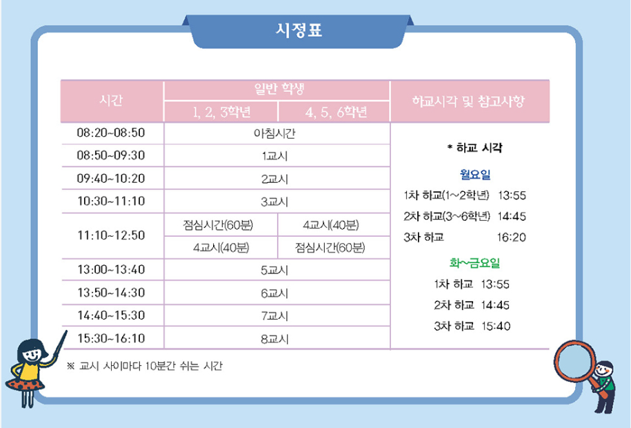 점심시간과 하교시간은 학년마다 다릅니다.