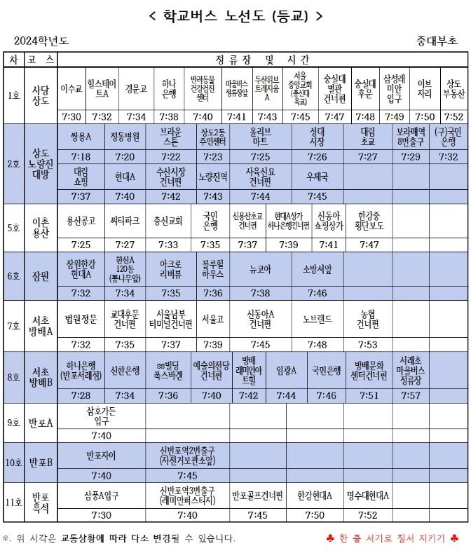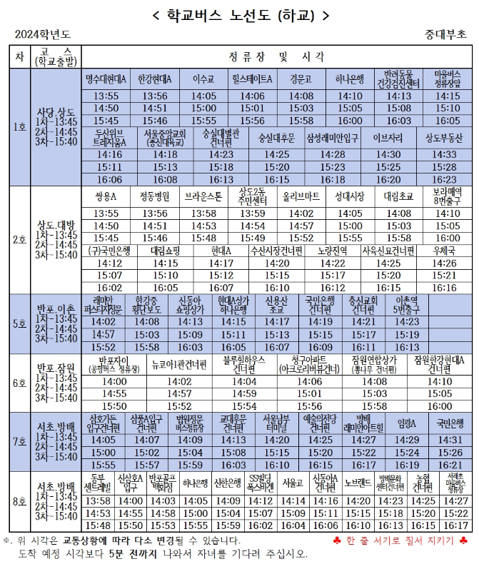 근처에 사시는게 아니라면 대부분 셔틀을 이용할 텐데요. 셔틀은 상도, 사당, 대방, 이촌, 반포, 잠원, 서초, 방배까지 운행합니다.